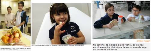 Na cantina do Colégio Saint Michel, os alunos escolhem entre chá, água de coco, suco de soja ou vitamina de frutas Daniel Castellano/Gazeta do Povo + ampliar imagem Valdeni Pavelski e o filho Lucas: preparo do lanche em casa para evitar colesterol <<1 2>>IdadeLancheira ou cantina? - Até 5 anos: o lanche é enviado pelos pais. Para comprar na cantina, a família precisa autorizar a escola e passar por escrito o que a criança pode comer. Mesmo assim ela não o faz sozinha, precisa da ajuda do professor. - Entre 6 e 9 anos: o lanche pode ser mandado de casa ou comprado na escola, pois a criança já tem idade para ir até a cantina sozinha. Os pais devem continuar supervisionando e saber o que o filho compra. - Acima dos 10 anos: a autonomia para ir à cantina é maior. Mas os pais precisam sempre orientar o filho sobre o que comprar. Multa Desde dezembro de 2005 a Lei Estadual 14.855 restringe a venda de alimentos considerados não saudáveis nas cantinas das escolas, tanto em instituições públicas quanto privadas. A multa pelo não cumprimento varia entre R$ 200 e R$ 4 mil. Segundo a fiscal do Centro de Saúde Ambiental de Curitiba, Sabrina Mendes Ortega Lyng, em cinco anos houve na capital apenas uma infração, o que significa que elas cumprem a determinação. "Como a cantina vendia poucas comidas que não eram permitidas, não chegou a ser multada. Apenas levou uma advertência". Uma vez por ano, um fiscal da Vigilância Sanitária visita cada escola para conferir se obedece à lei. Teste Responda as questões abaixo e veja se a hora do recreio não está sendo uma inimiga da boa alimentação do seu filho. 1) Qual é o lanche mais frequente que seu filho consome na escola? A) Salgado assado, suco de frutas ou frutas B) Bolo simples e suco industrializado C) Salgadinhos de pacote com bebida industrializada 2) Quando seu filho pede para comer guloseimas, você atende prontamente? A) Nunca B) Raramente C) Frequentemente 3) Quantas porções de vegetais (frutas, hortaliças e legumes) seu filho ingere por dia? A) 6 ou mais B) 3 a 5 C) Não ingere 4) Qual a porção de leite e derivados que seu filho ingere por dia? A) 3 B) 1 a 2 C) Não ingere 5) Você oferece alimentos ao seu filho como recompensa de bom comportamento? A) Nunca B) Raramente C) Frequentemente 6) Com que frequência a criança come em fast food? A) Menos de 1 vez por mês B) 2 a 3 vezes ao mês C) 1 ou mais vezes por semana 7) Você costuma colocar no seu prato os mesmos alimentos que indica ao seu filho? A) Frequentemente B) Raramente C) Nunca 8) A ingestão diária de líquidos pelo seu filho é: A) 4 ou mais copos de 200 ml B) 2 a 3 copos de 200 ml C) 2 ou menos copos de 200 ml 9) Seu filho ingere alimentos integrais, como arroz, massas e pães? A) Frequentemente B) Raramente C) Nunca 10) A ingestão de alimentos fora de hora pelo seu filho ocorre: A) Nunca B) Raramente C) Frequentemente Resultado: Para obter seu resultado some 2 pontos para cada resposta com a letra A, 1 ponto para letra B e 0 para letra C. 18 a 20 pontos - Excelente.Você está de parabéns com relação à alimentação do seu filho. Com este padrão alimentar ele terá menos chance de desenvolver doenças crônicas relacionadas à má alimentação. 12 a 17 pontos - Bom. Continue cuidando da alimentação do seu filho. Reveja os pontos que podem ser melhorados. Abaixo de 12 pontos - Ruim. Cuidado, este padrão alimentar aumenta a chance do seu filho tornar-se um adulto com sérios problemas de saúde. Fontes: teste elaborado pelas professoras do curso de Nutrição da Universidade Positivo (UP), Camila R. Prim Calvi, Eda Maria Arruda Scur e Kátia Castro de Lacerda. Serviço: A Clínica de Nutrição da Universidade Positivo oferece atendimento gratuito sobre alimentação infantil e orientação a crinaças com sobrepeso. Contato pelo (41) 3317-3167. Conheça os principais perigos que rondam o ambiente escolar e o que os pais devem fazer para evitar que os filhos façam parte do grupo de 22% das crianças que estão acima do peso no país, dado divulgado em junho por uma pesquisa da Universidade Federal de São Paulo (Unifesp). Café se toma em casa Antes de ir para a aula o estudante deve tomar café da manhã em casa e em quantidade suficiente. Isso evita que chegue na escola e coma na cantina antes de entrar em sala. Se ele toma café correndo ou ingere qualquer coisa porque acordou atrasado, vai comer em excesso depois. A nutricionista da Escola Saint Michel, Marcela Laufert Caran, explica que é comum os jovens comerem em panificadoras ao redor do colégio antes de entrar. "Geralmente optam por fritura, massa, doce ou algum produto industrializado, o que faz muito mal para a saúde." Se o aluno vai com muita fome para a hora do intervalo, a tendência é comer uma quantidade acima da ideal."Tem criança que não se contenta apenas com sua fruta ou salgado assado. Come os seus e ainda o de algum colega que não queira. Então, o que era para ser saudável passa a fazer mal pela grande quantidade", conta Marcela. O médico endocrinologista e membro da Associação Brasileira para o Estudo da Obesidade e da Síndrome Metabólica, Amélio Fernando de Godoy Matos, diz que o ideal é que antes de sair de casa pela manhã o jovem coma pelo menos uma fruta, uma fatia de pão integral, leite desnatado sem açúcar ou com adoçante, queijo e, no máximo duas vezes por semana, um ovo. "Se seguir isso ele vai sentir menos fome na hora do intervalo e ter pouca chance de ganhar peso." Perigo no bolso Ao contrário das cantinas, lanchonete, banca de revistas, carrinho de doce e pipoca e panificadora ao redor das escolas não têm restrição à venda de alimentos. Para os menores, que ainda não ganham dinheiro dos pais, não há perigo, mas a partir dos 11 anos, quando a criança começa a ganhar dinheiro para o lanche, o acesso ao que faz mal é mais fácil. Balas e chicletes são os principais vilões consumidos com aquela verba que sobra. Muitas